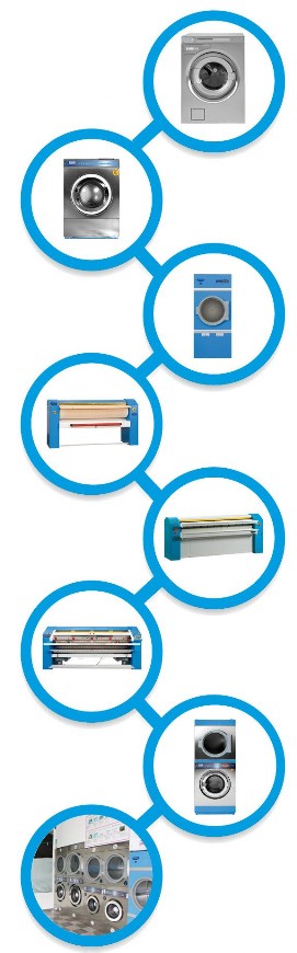 IMESA SpA. teljes ipari mosodai berendezések skáláját kínálja melyeket a saját Olaszországi - Cessaltoi gyárában állít elő Mosógépeket, Szárítógépeket, Mángorló vasalókat, Szárítós kalander vasalókat.